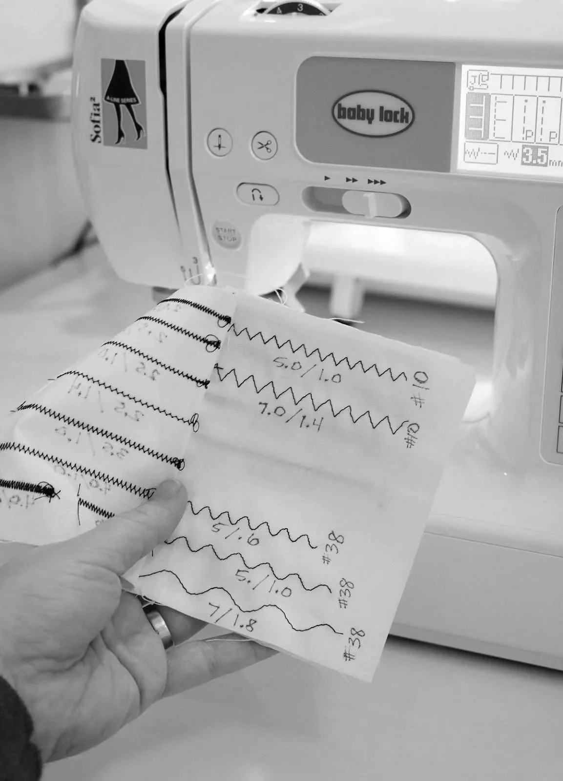 Adjust tension, stitch length, and width for various fabrics
